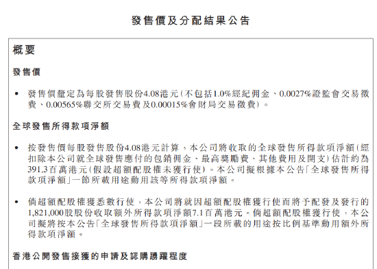 乐华娱乐定价4.08港元,不计超额配股权,募资3.91亿港元,公开发售超购27.68倍,国配超购0.29倍,公司一手中签率50%。