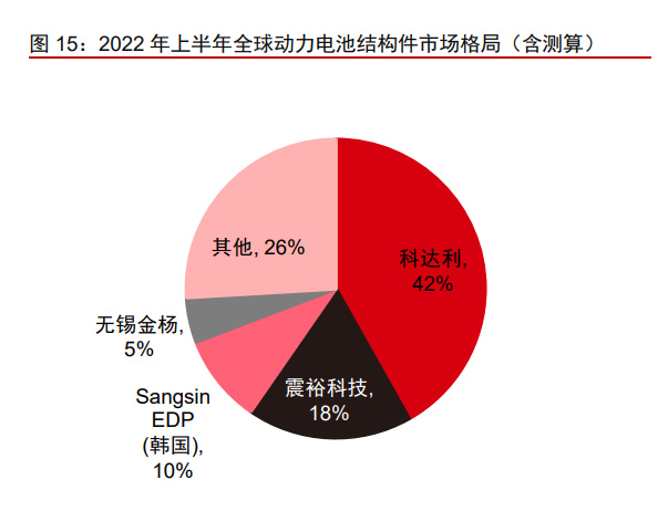 横向来看,电池结构件在锂电池上游各环节中格局最为集中。根据 GGII 等第三方统 计数据及我们的测算,2022 年上半年国内三元正极/铁锂正极/负极/隔膜/电解液/结构件 CR2 分别为 23%/40%/39%/59%/50%/83%。电池结构件行业在锂电池上游的各主要材料 环节中,市场格局的头部份额最为集中。