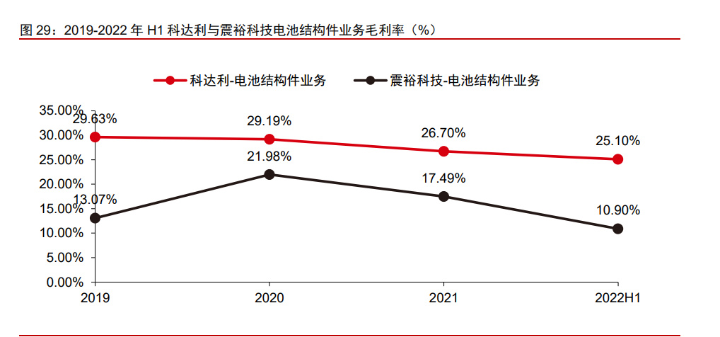 动力电池精密结构件属于锂电产业链,具备认证时间长的特点,从结束研发到形成稳 定供应能力需要约 3-4 年时间。复盘行业主要玩家在动力电池结构件业务上的发展历程, 科达利 2007 年开始研发动力电池精密结构件,2010 年研发成功,到 2014 年动力电池精 密结构件销售额达 2 亿元,距离 2010 年研发成功相距 4 年时间;震裕科技 2015 年成立 锂电池结构件事业部,到 2019 年形成 2.2 亿元对外销售收入,中间同样相隔 4 年时间。