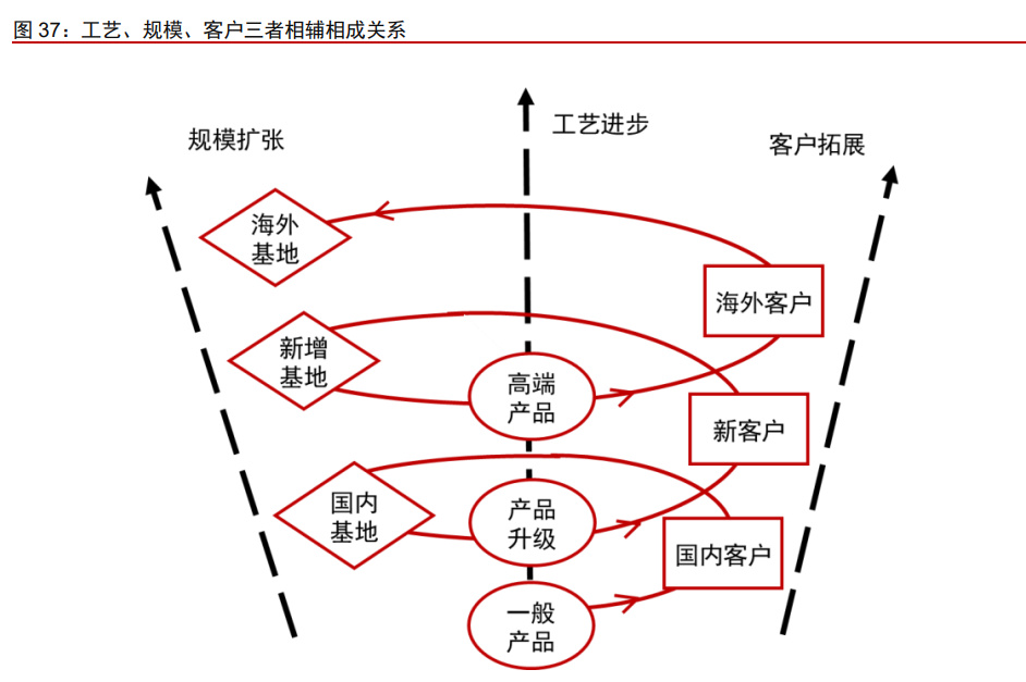工艺、规模、客户相辅相成,螺旋上升。工艺、规模和客户是行业三大核心竞争要素, 三者是相辅相成的关系。工艺水平是获得客户订单的核心,具备和客户就近配套建厂的资 金实力、形成规模是形成客户深度合作绑定的前提。客户的绑定、共同研发又是工艺水平 持续进步的推力,是规模扩张后产能利用率提升的订单保障,最终工艺与资金再去支持进 一步的客户拓展。在三者相互之间的互相催化中,企业完成工艺、规模和客户的螺旋上升。