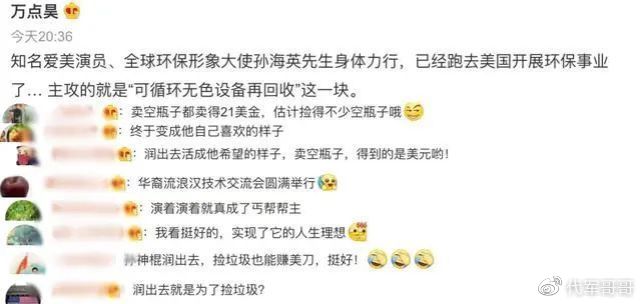 该动态一经爆出,便迅速引发舆论关注。网友们评论道:全球环保形象大使孙海英先生已跑去美国开展环保事业,终于活成他希望的样子,就是为了出去捡垃圾?