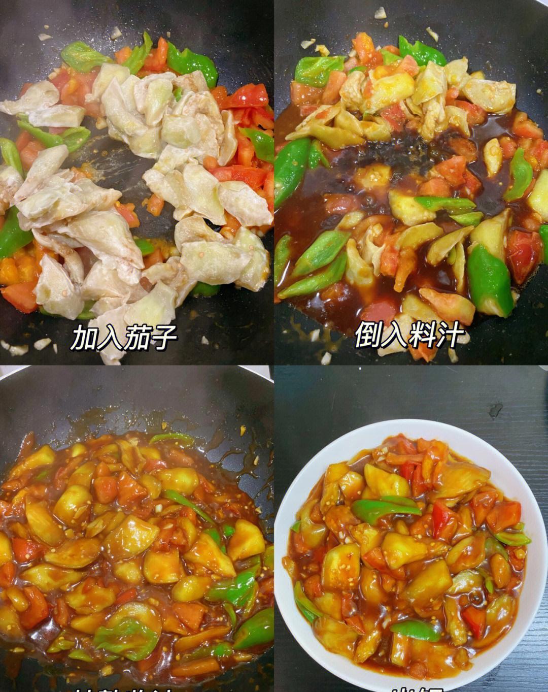 加入腌好的茄子翻炒,让茄子均匀受热。