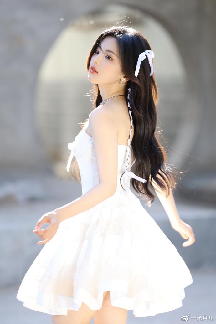 脖子上还挂着一条唯美的项链,而且这件白色吊带连衣裙,显得格外的靓丽,一股小清新味道,因为作为一个小姐姐而言,她属于那种肤白貌美大长腿的女神,所以这件衣服能很好地衬托出来自己皮肤白皙的那种感觉。
