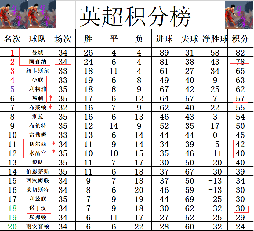 积分榜方面,曼城击败利兹联夺取10连胜,轮次一样的情况下4分优势力压阿森纳领跑,阿森纳今晚对阵纽卡斯尔不容有失,否则曼城很可能提前夺冠。利物浦豪夺6连胜后,在多赛2轮的情况下将和曼联的分差缩小到仅有1分,曼联也是重新感受的争四压力。热刺赢球止住4轮不胜的颓势后则是暂时超过布莱顿2分回到前6。兰帕德接手切尔西帅位后已经是双线6连败,今天他们终于赢球,超过水晶宫夺回下半区第一的位置,同时他们比诺丁汉多了12分,多了27个净胜球,可以说已经保级成功。