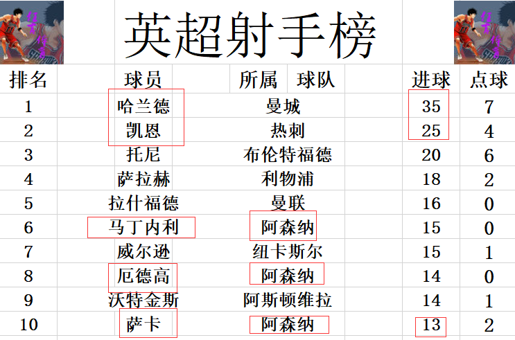 射手榜方面,金靴现在基本上是没有悬念了,现在球迷们期待的是哈兰德能不能突破40球。凯恩25球,第2的位置还是很稳。萨拉赫18球,赛季还是有希望上20的。布赖顿霍夫是前6唯一没有球员进入前十的球队,阿森纳则是前十人数最多的,马丁内利,萨卡跟厄德高都在前十之列。