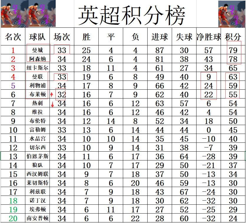积分榜方面,曼城和阿森纳的争冠还在继续,曼城昨天补赛大胜后,真正超过了阿森纳登顶成功。争四方面,纽卡斯尔和曼联的优势本来蛮大,但是今天曼联被绝杀后,利物浦的机会来了,当然主动权还是在曼联这边,最后5场他们赢下3场就能让利物浦彻底绝望。理论上今天绝杀超过热刺升到第5的布莱顿霍夫机会比利物浦还大些,但事实上布莱顿霍夫最后6场比赛难度太大,他们还要对阵阿森纳,纽卡斯尔和曼城,虽然争四难度大,但是布莱顿争6倒是能压制热刺的。