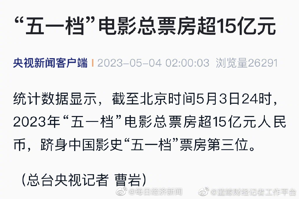 【#五一档电影总票房超15亿#,你今年五一节去看电影了吗】 统计数据显示,截至北京时间5月3日24时,2023年“五一档”电影总票房超15亿元人民币,跻身中国影史“五一档”票房第三位。(央视新闻,泽塔)