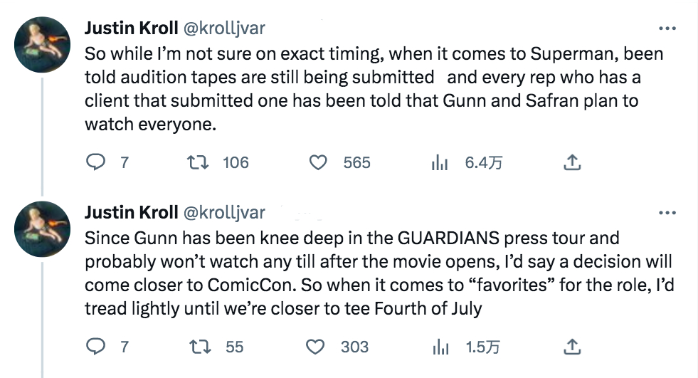 #TNABO# 超人的选角据Deadline记者Justin Kroll推测预计最快也要等到7月公布。他透露目前各个经纪人还在帮自己代理的演员们递交试镜表演录像,而「DC影业」负责人詹姆斯·古恩与彼得·萨夫兰打算在《银河护卫队3》宣传期结束后亲自观看每一份上交的资料。如果一切顺利的话,新扮演者预计会在SDCC前后正式公布。