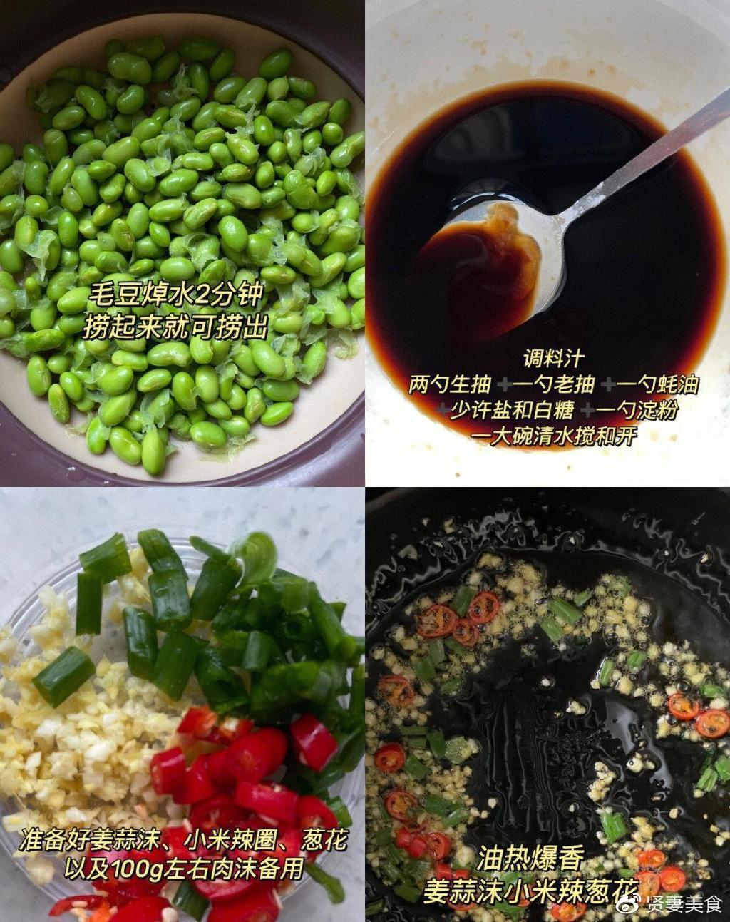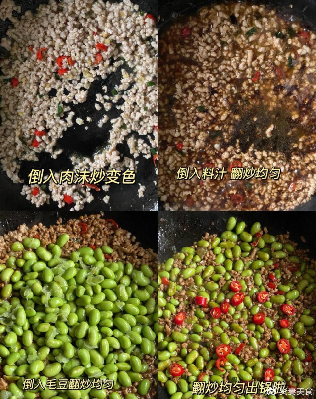 首先,我们需要热锅加油,爆香姜蒜小米辣和葱花。然后加入肉沫,翻炒至变色。接下来,倒入混合好的调料汁,翻炒均匀。最后,加入焯好水的毛豆,翻炒均匀即可出锅。