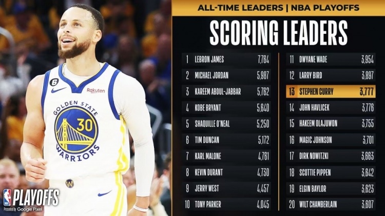 目前库里(赛前为3756)在季后赛总得分榜上已经超越哈弗利切克(3776),上升至历史第13位。