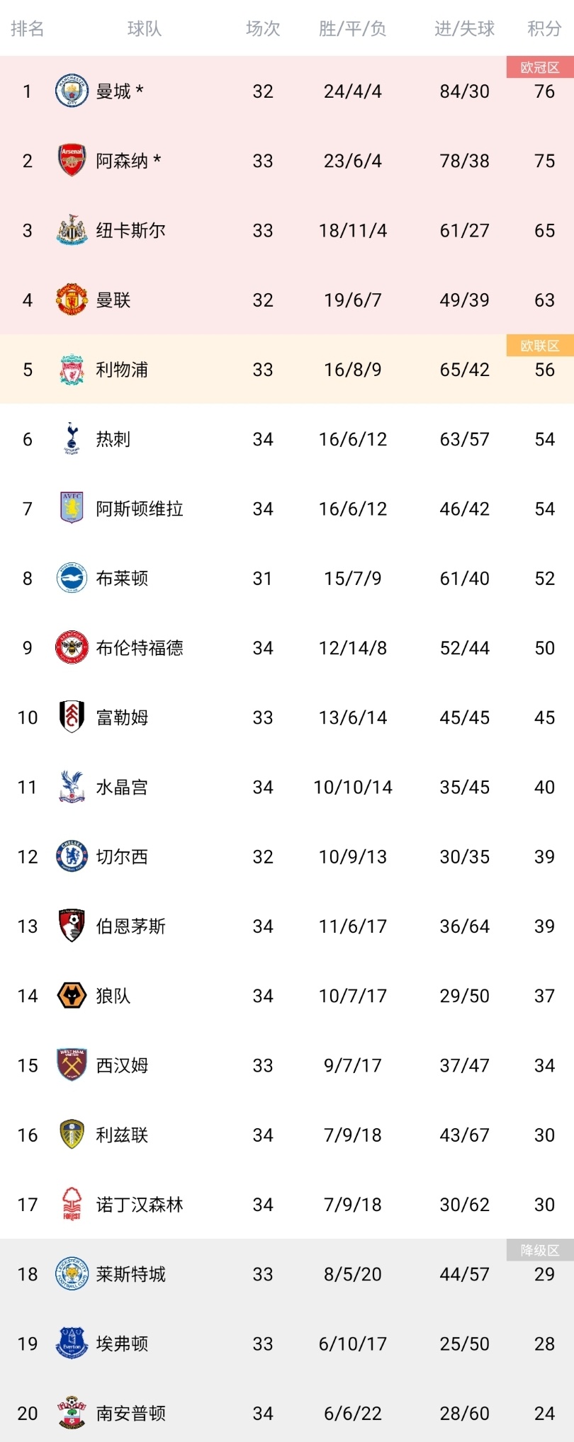 其他比赛中,曼城客场2-1击败富勒姆,超越阿森纳1分登顶,哈兰德破门追平英超单赛季进球纪录,阿尔瓦雷斯造点并破门;纽卡斯尔主场3-1逆转南安普顿,仍居联赛第3位,威尔逊梅开二度;伯恩茅斯主场4-1大胜利兹联,保级形势大好。