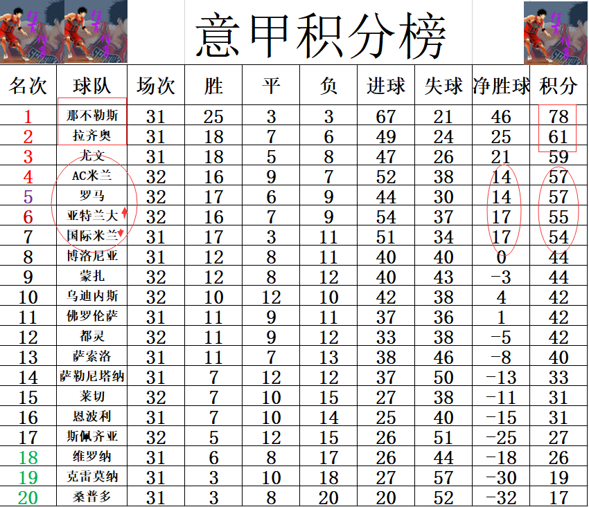 积分榜方面,那不勒斯17分领跑夺冠在望,争冠没有悬念,争四则是非常惨烈。AC米兰今天最后一次进攻机会抢到1分后,他们就得以继续以进球多优势力压罗马排在第4,罗马则是失去追上尤文的大好机会。亚特兰大夺取2连胜后超过国米1分,落后AC米兰,罗马2分升至第6,若是国米本轮能赢拉齐奥的话,那这争四真就热闹翻。