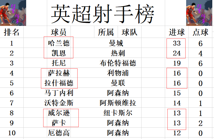 射手榜方面,哈兰德33球高居榜首,凯恩今天未能进球,还是24球位居第2,托尼19球排在第3。拉什福德今天传射建功,追上萨拉赫16球并列第4。威尔逊2轮打进3球后追上萨卡13球并列第8,这样的话前十门槛也就被提高到了12球。