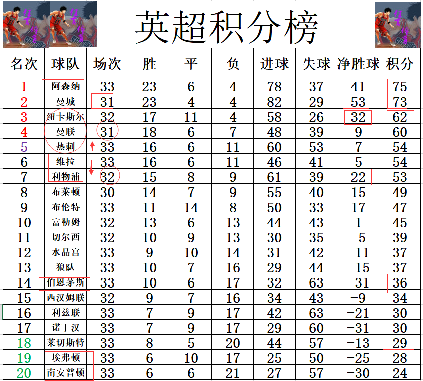 积分榜方面,曼城在昨天大胜阿森纳之后已经将夺冠主动权牢牢掌握在手中,他们少赛2轮落后2分,可以说他们现在有平2场或者输一场的容错空间,阿森纳很难争冠了。争四方面,纽卡斯尔连续两轮大胜后进一步稳固第3的位置,加上曼联3分变1分,纽卡斯尔得以获得2分优势。热刺虽然绝平抢到1分,暂时超过利物浦,维拉回到前5,但是他们比曼联多赛2轮落后6分,争四已经是很渺茫。保级方面,伯恩茅斯客场小胜远离降级区,南安普顿5轮只拿到1分,基本上降级难逃,而他们这1分偏偏是在阿森纳身上拿的,阿森纳这争冠真是一言难尽!