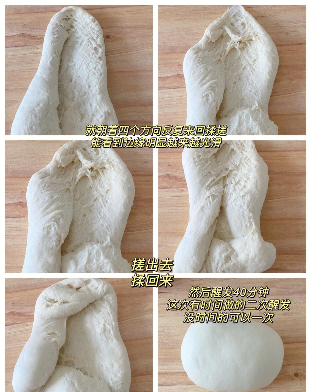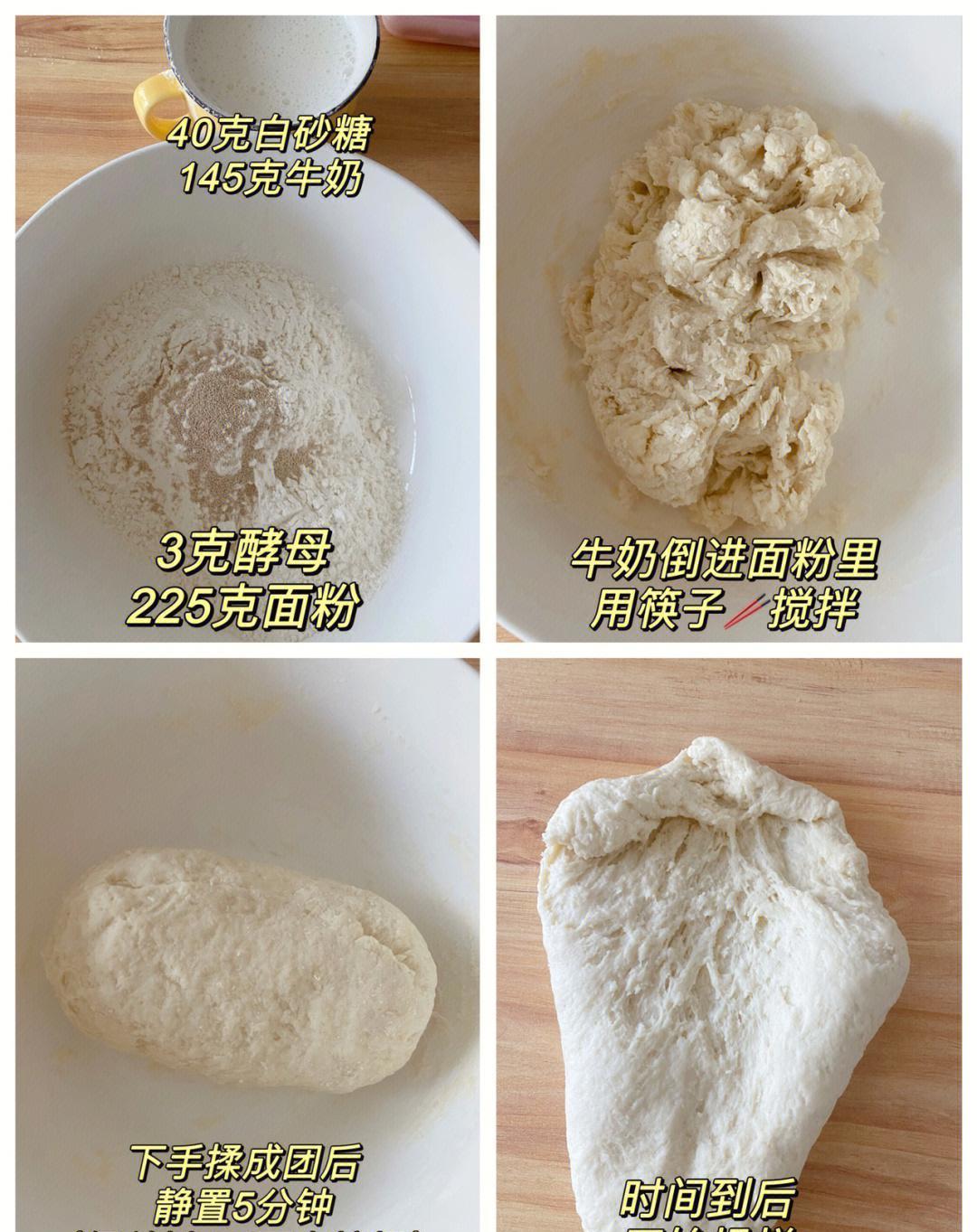 慢慢加入牛奶和水,边倒边搅拌,揉成面团。
