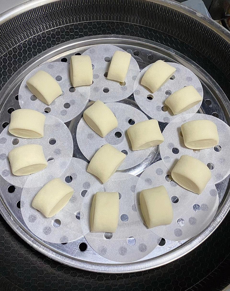 小馒头切记不要放得太密,蒸发出的水汽需要有空间才能蒸熟馒头。