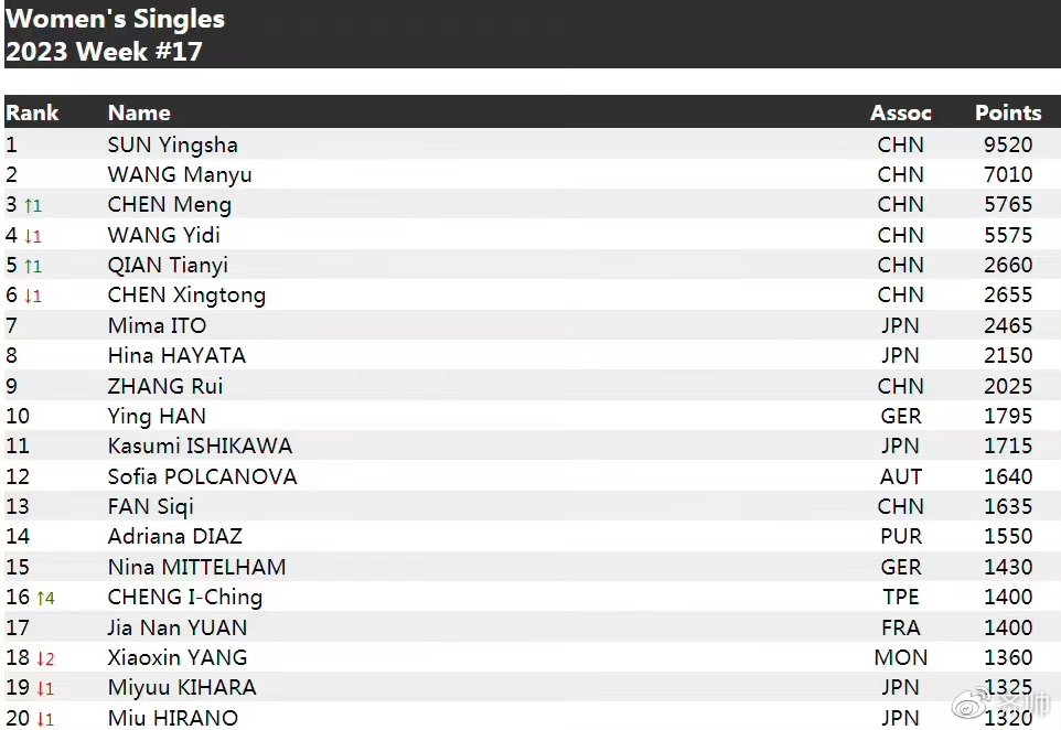 女单前10:第一名孙颖莎。第二名:王曼昱。第三名:陈梦。第四名:王艺迪。第五名:钱天一。第六名:陈幸同。第七名:伊藤美诚。第八名:早田希娜。第九名:张瑞。第十名:韩莹。