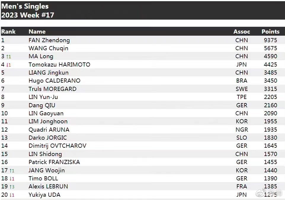 通过这两站比赛,国际乒联的排名有了新的变化。男单方面,最直接的点就是马龙反超张本智和!今年3月份,张本智和的排名冲到了世界第3,这也是这个日本华裔小天才最高的世界排名:排名世界第1的还是遥遥领先的樊振东,第二是王楚钦。马龙一度被张本智和超越。