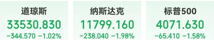 美股三大指数低开低走集体收跌,道指下跌344.57点,跌幅1.02%;纳指跌1.98%;标普500指数跌1.58%。