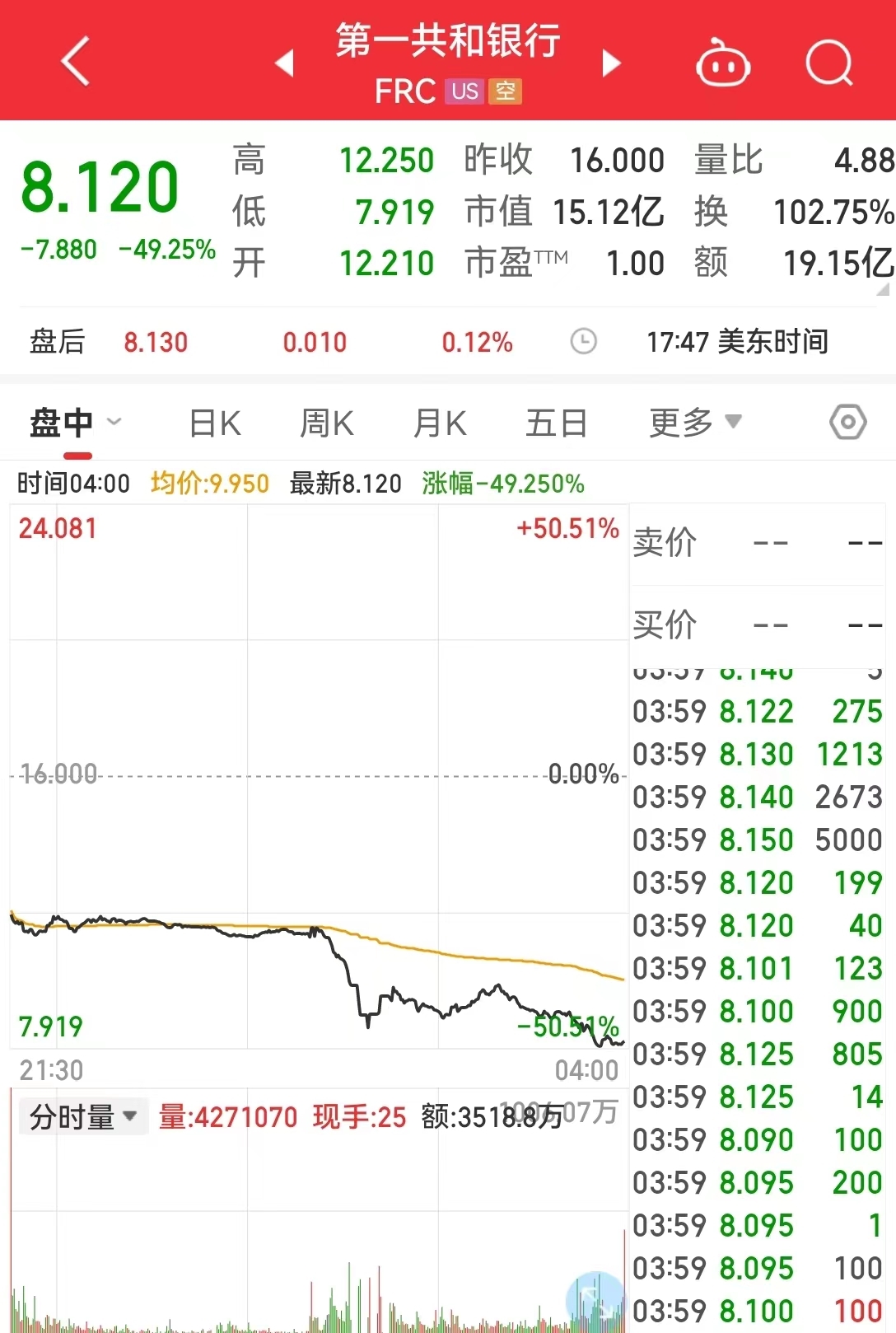 当地时间4月25日,美国第一共和银行跌近50%,报8.12美元,市值15.12亿美元。今年来,美国第一共和银行累跌超93%。据财联社,美国第一共和银行考虑出售高达1000亿美元的资产。