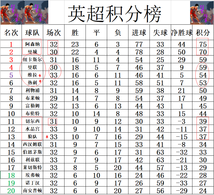积分榜方面,阿森纳和曼城的冠军争夺到了白热化阶段,阿森纳多赛2轮5分优势领跑。纽卡斯尔和曼联在争四大战中占据主动,领先优势不小。维拉今天再次赢球后近10轮8胜2平保持不败,一举超过热刺1分升到第5,落后曼联,纽卡斯尔5分。狼队近4轮3胜,追上水晶宫,差下半区“领跑”的切尔西2分,保级形势一片大好。