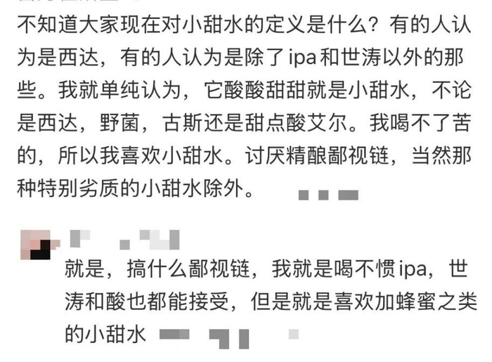 当然,在这样的趋势下,也有一些传统酒客,对新兴的小甜水精酿存在鄙视链心态,认为很多果味精酿都是“科技与狠活”的香精勾兑产品。