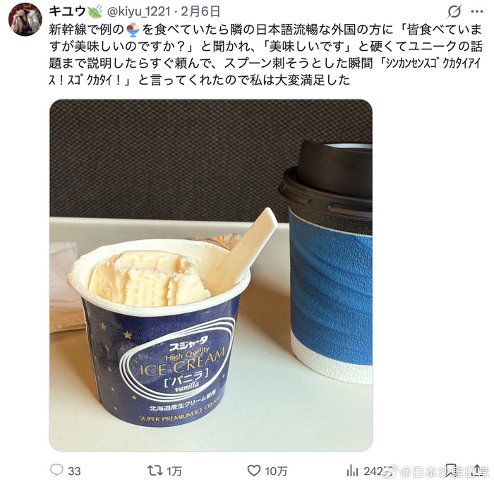 在新干线上我正吃那款很有名的冰淇淋,旁边一位日语很流利的外国人问我:“大家都在吃这个,很好吃吗?”我回答“好吃”,还给他解释了新干线的冰淇淋很硬是个很有名的梗。他马上也点了一份,把勺子插进去的瞬间,说了一句:“新干线超硬冰淇淋!真的超硬!”我顿时爽到了。