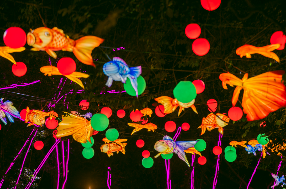 各式各样的灯组琳琅满目:“喜迎新春”“鲤鱼跃龙门”“梅州女神”“龙马精神”“锦鲤通道”,一场融合深厚客家文化与当代潮流体验的新春盛宴。