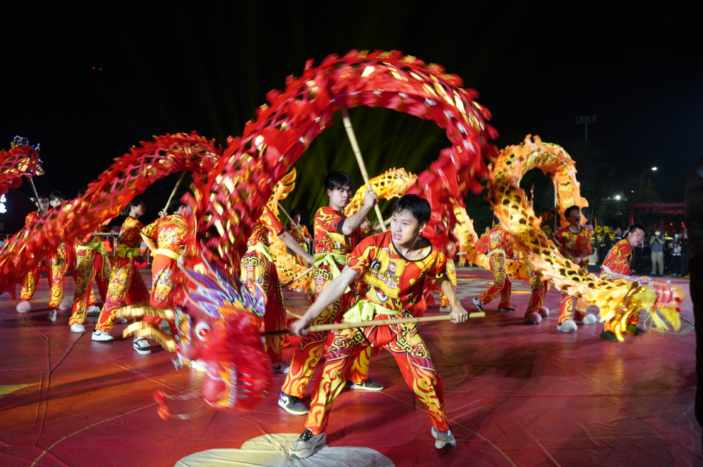全程都是高光时刻:柔美灵动的省级非遗“花环龙”带来暖场歌舞表演《花环龙舞·喜迎春》,国家级非遗“烧火龙”压轴出场,将现场气氛推向高潮;最后,数千架无人机缓缓升空,以璀璨光影在天幕中勾勒出盛世图景,完成一场从传统到现代的精彩接力。