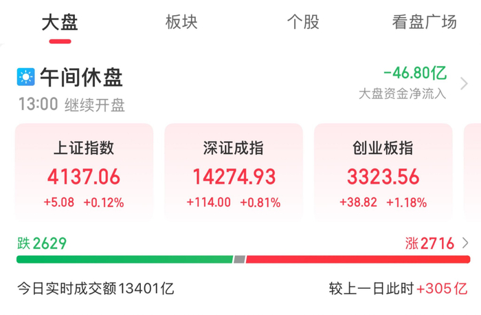A股三大指数早盘集体上涨,截至午盘,沪指涨0.12%,深成指涨0.81%,创业板指涨1.18%,北证50指数涨0.49%,沪深京三市半日成交额13401亿元,较上日放量305亿元。全市场超2700只个股上涨。